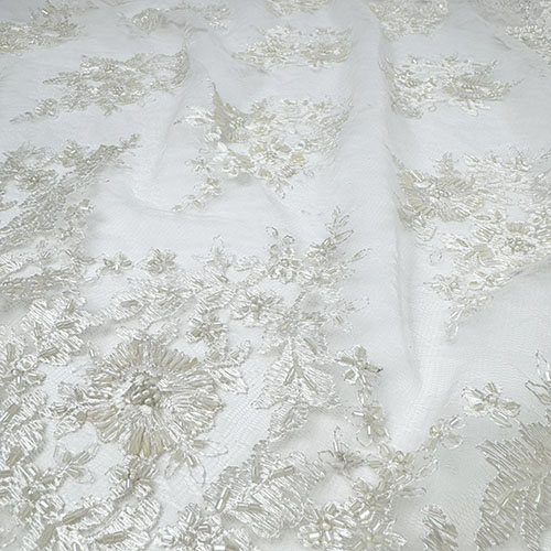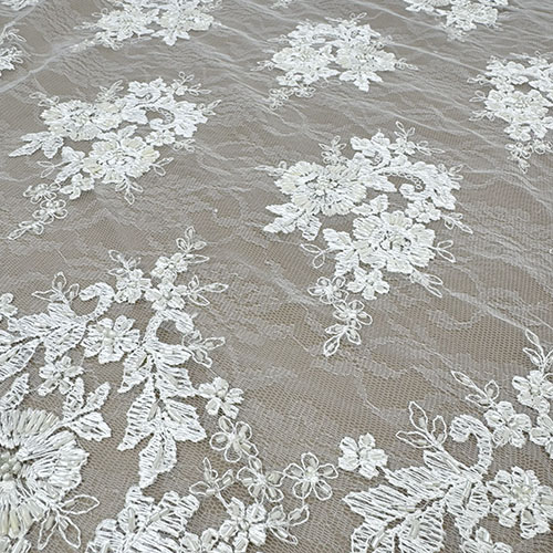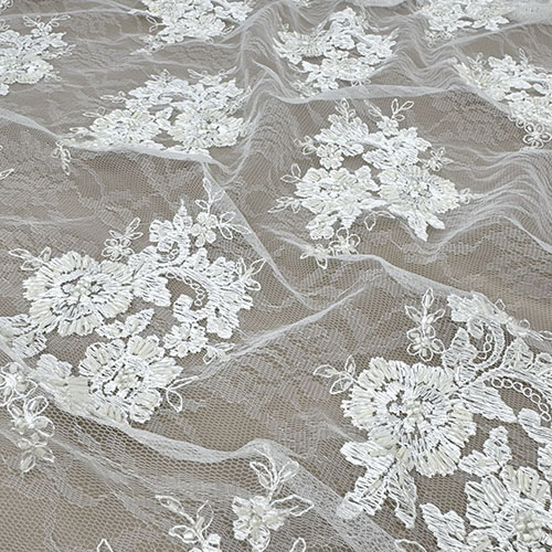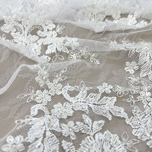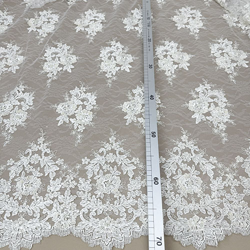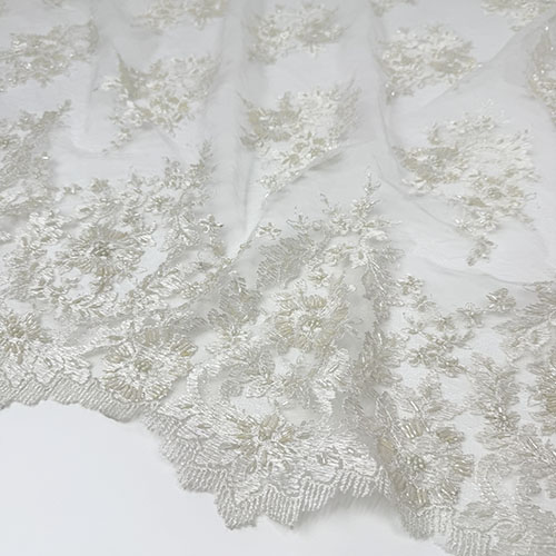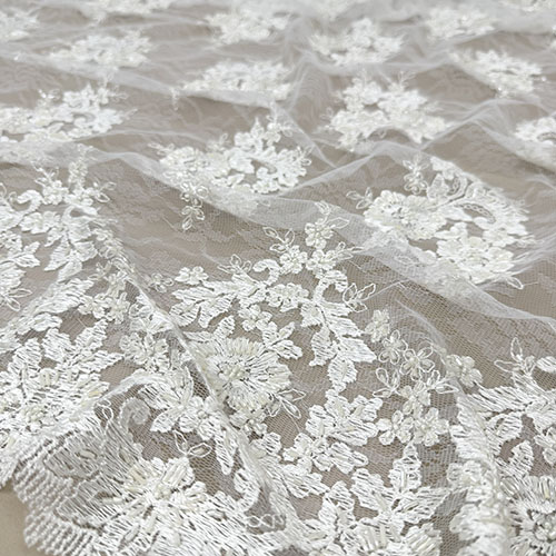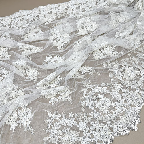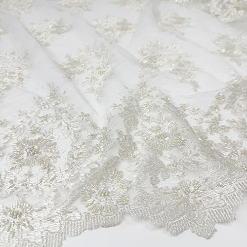 Ecry čipka na tilu sa chantilli uzorkom i bordurama s obje strane te našivenim perlicama za glamurozne vjenčanice i večernje haljine!