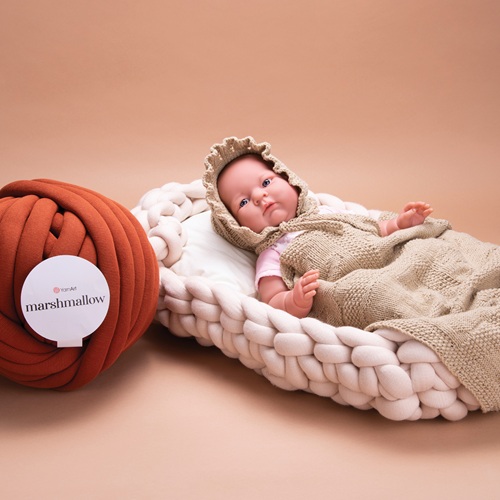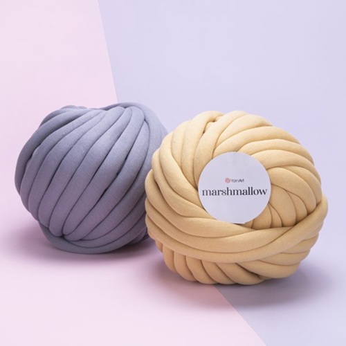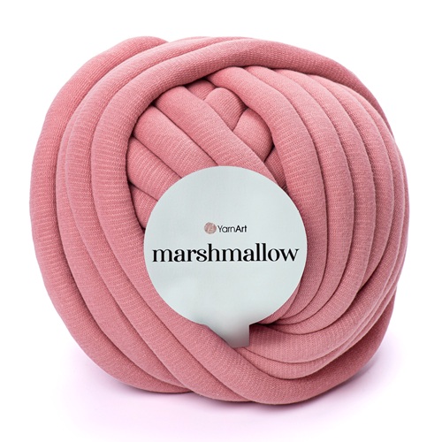 Marshmallow je moderna JUMBO pređa izrađena od pamučne tube punjene poliesterskim vlaknima, koja pruža iznimnu mekoću uz stabilnost i postojan oblik. Zahvaljujući punjenju, pređa je lagana, podatna i daje bogatu, „chunky“ teksturu s lijepo definiranim bodovima.